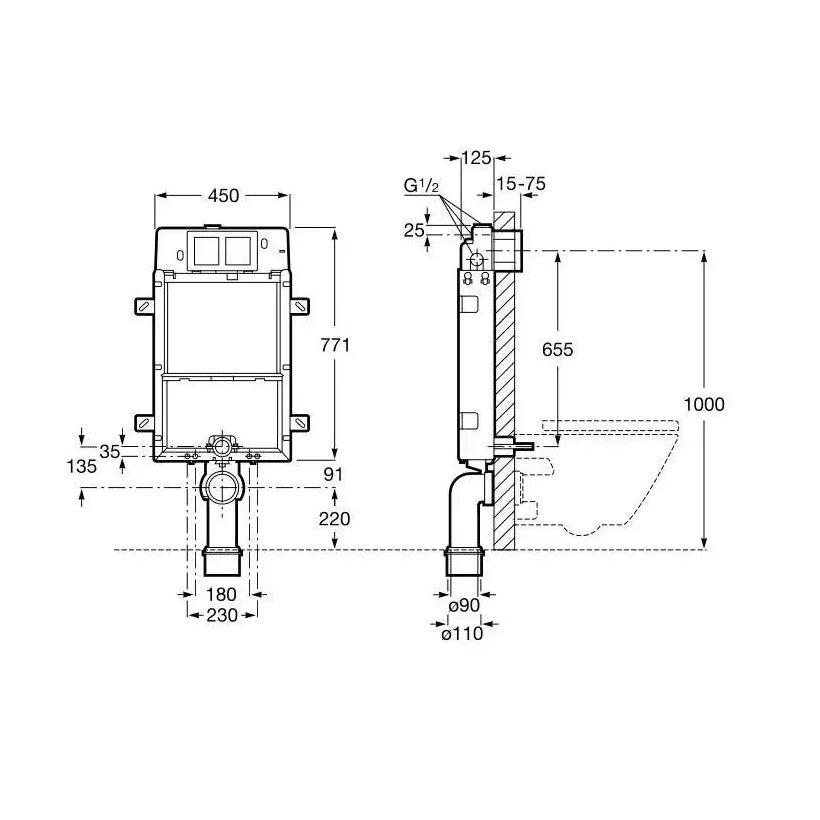 - - Actuation plate: PL1 DUAL push button plate, with dual flush and front activation.