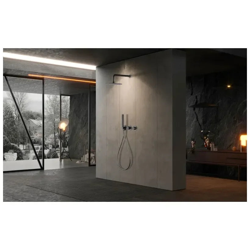 - - Model: Built-in thermostatic shower set with extra-flat 25 cm round shower head, designed by Imex with a metallic black finish.