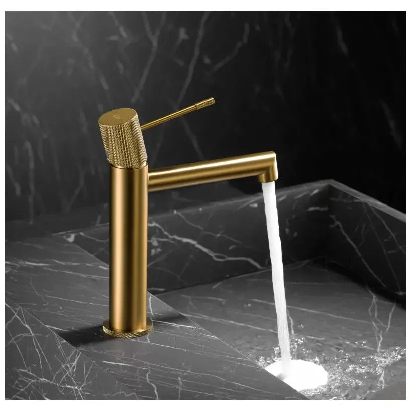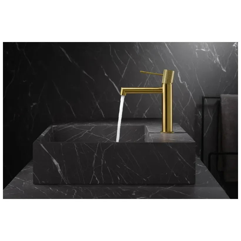 - - Categoria: Torneiras para lavabo (torneiras de banheiro, torneiras para lavatórios, torneiras para pias): monocomando, de bico curto, em latão, com design moderno, ouro escovado, com alavanca esculpida e corpo arredondado.