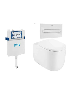 ROCA BEYOND Pacote de vaso sanitário embutido na parede Rimless 58 cm de profundidade, saída dupla, tampa com amortecimento, caixa acoplada e placa de acionamento