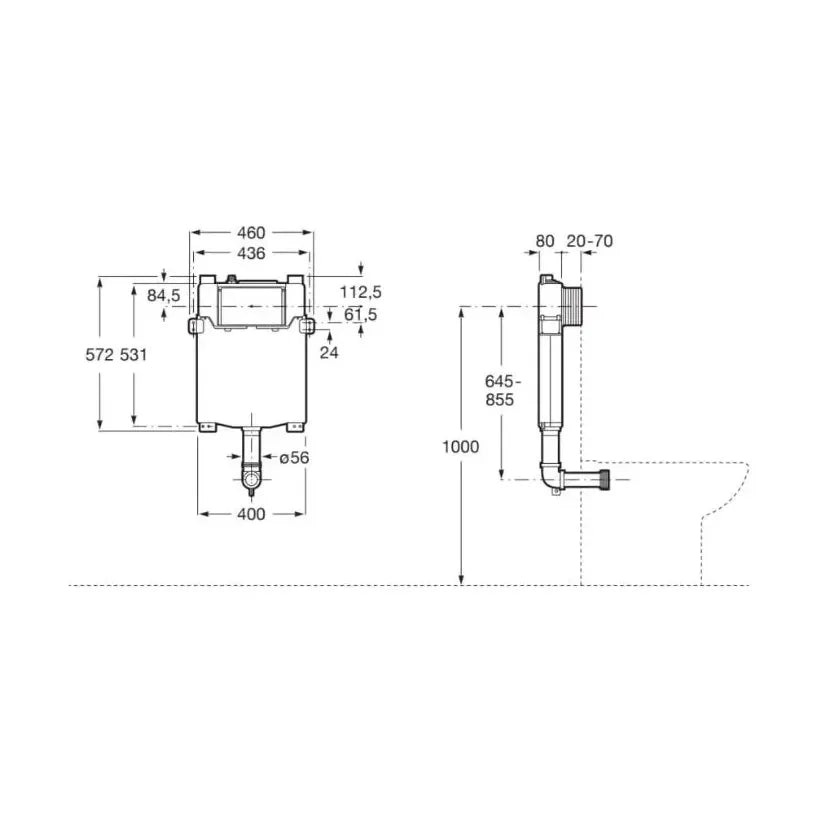 • - Dimensões da Caixa Acoplada: 46 cm de largura, 64,5 cm de altura, 8 cm de profundidade. Modelo BASIC TANK ONE COMPACT.