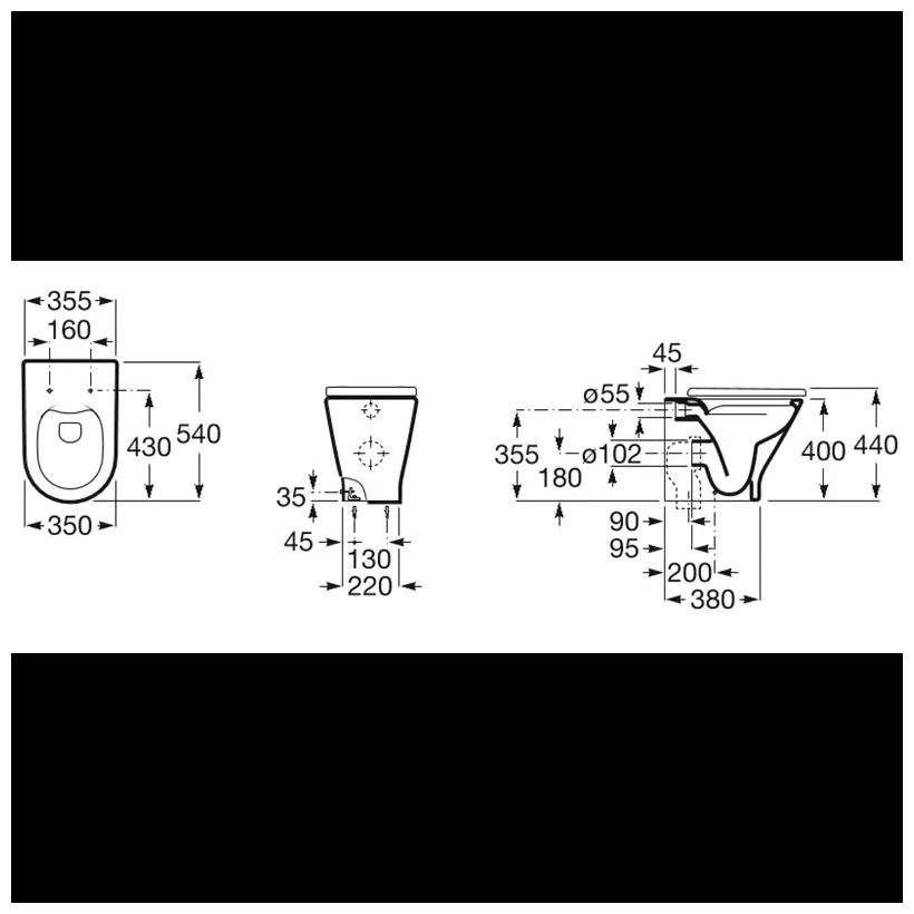 • - Dimensões: O sanitário tem 35,5 cm de comprimento, 54 cm de largura e 40 cm de altura, com design compacto para espaços pequenos.