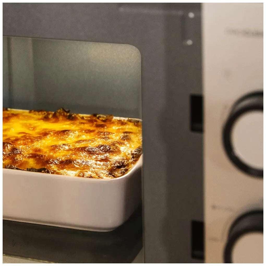 - Browns your dishes: 800W grill with halogen heating elements for a golden, crispy finish.