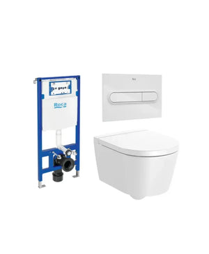 Rimless Wall-Hung Toilet Pack 48 cm Deep Horizontal Outlet Cushioned Lid Cistern Push Plate ROUND ROCA