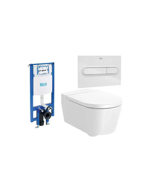 Pack Inodoro Suspendido Rimless Salida Horizontal Tapa Amortiguada Cisterna Placa Pulsadora ROUND ROCA