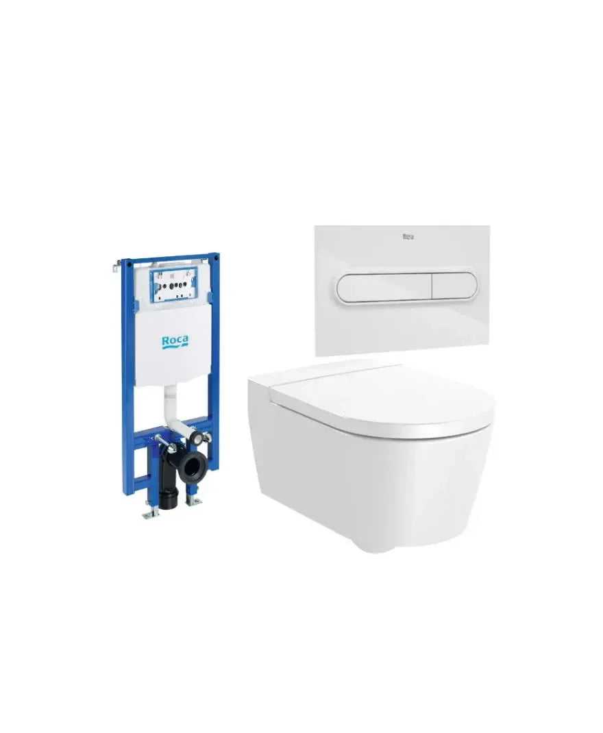 ROCA ROUND Pack inodoro suspendido Rimless salida horizontal tapa amortiguada cisterna placa pulsadora
