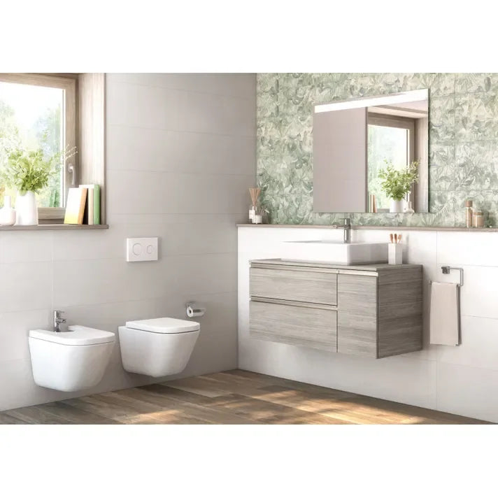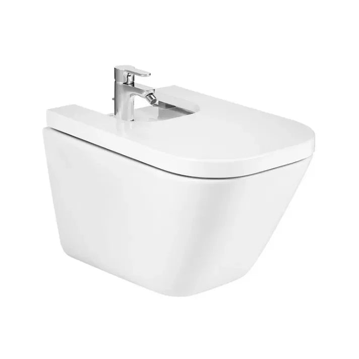Bidé suspendido de porcelana con fijaciones ocultas y un acabado en color blanco The Gap Square Roca
