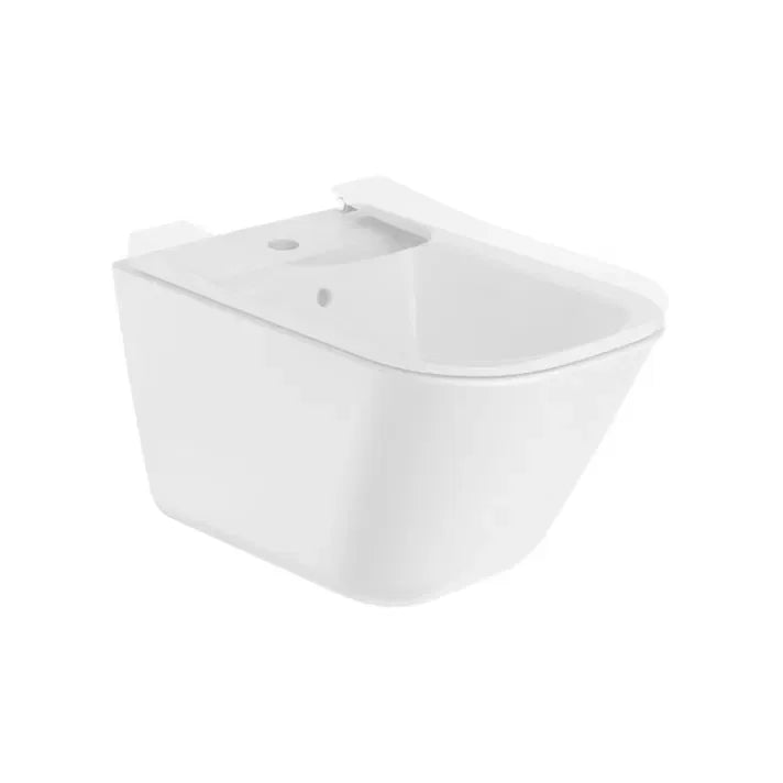 Bidé de estilo moderno suspendido con forma cuadrada, diseñado para maximizar el espacio en el cuarto de baño y facilitar la limpieza. Este bidé mide 35 cm de largo x 54 cm de ancho x 40 cm de alto y está fabricado en porcelana con un acabado en color blanco. Cuenta con un agujero para la grifería (grifería no incluida).