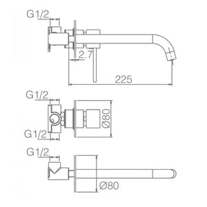 Torneira monocomando para lavatório ou banheira, com montagem na parede. A bica e o misturador estão em duas partes independentes. Fabricado em latão, não necessita de caixa registradora para instalação. Dimensões da torneira: vinte e dois vírgula cinco centímetros de comprimento x 80 milímetros de diâmetro na base.